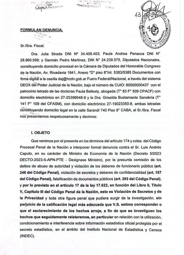 Los diputados de Unión por la Patria Julia Strada, Germán Martínez y Paula Penacca denunciaron penalmente este viernes al ministro de Economía, Luis Caputo, por "irregularidades varias vinculadas al funcionamiento" del Instituto Nacional de Estadística y Censos (INDEC).